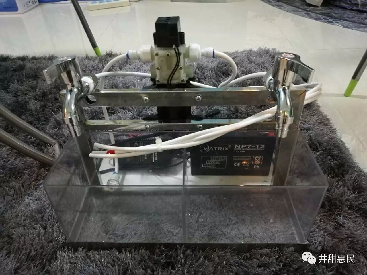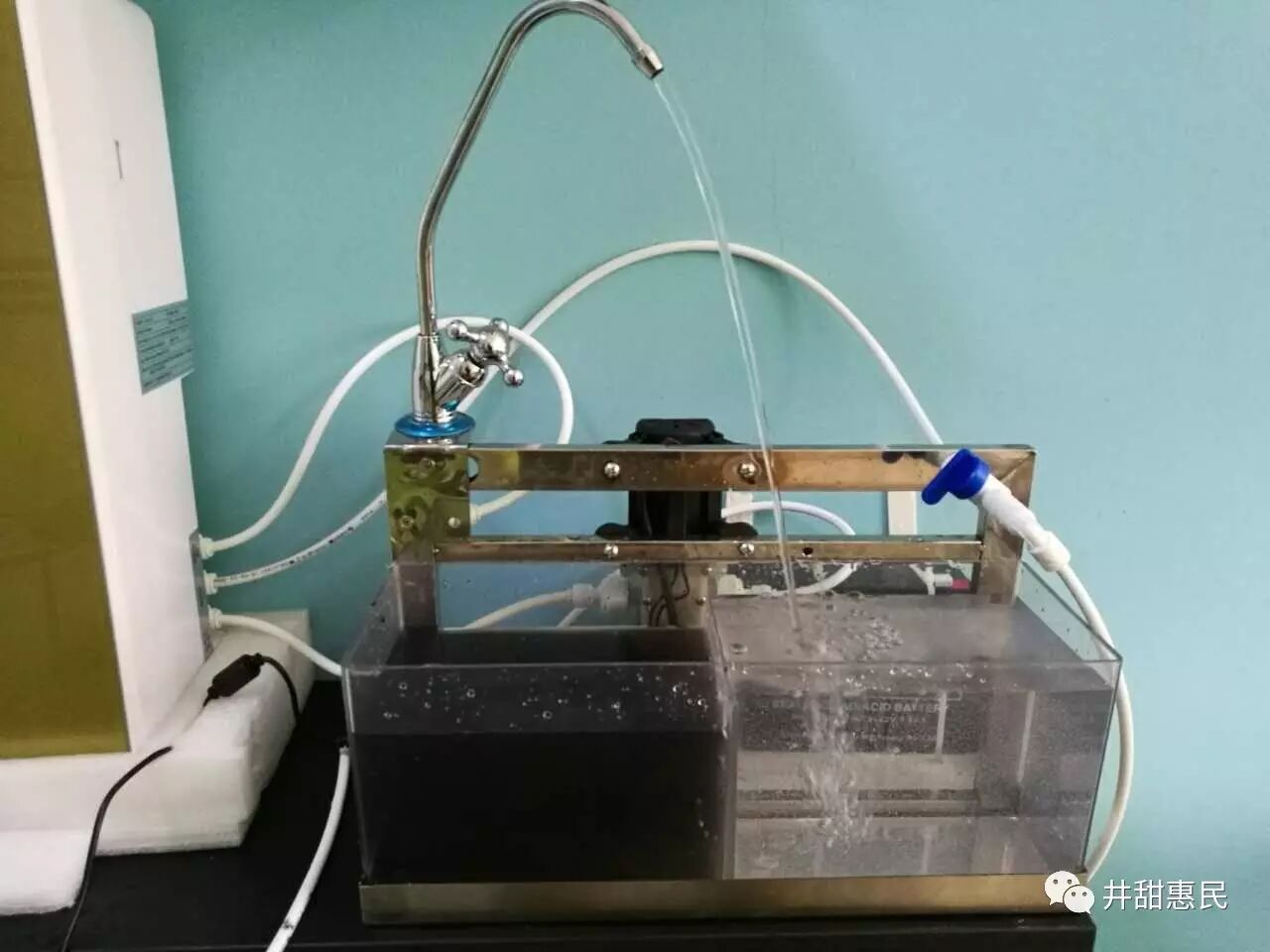 实验过程:污水通过井甜惠民机型的过滤后,流出了可以直接饮用的矿物水